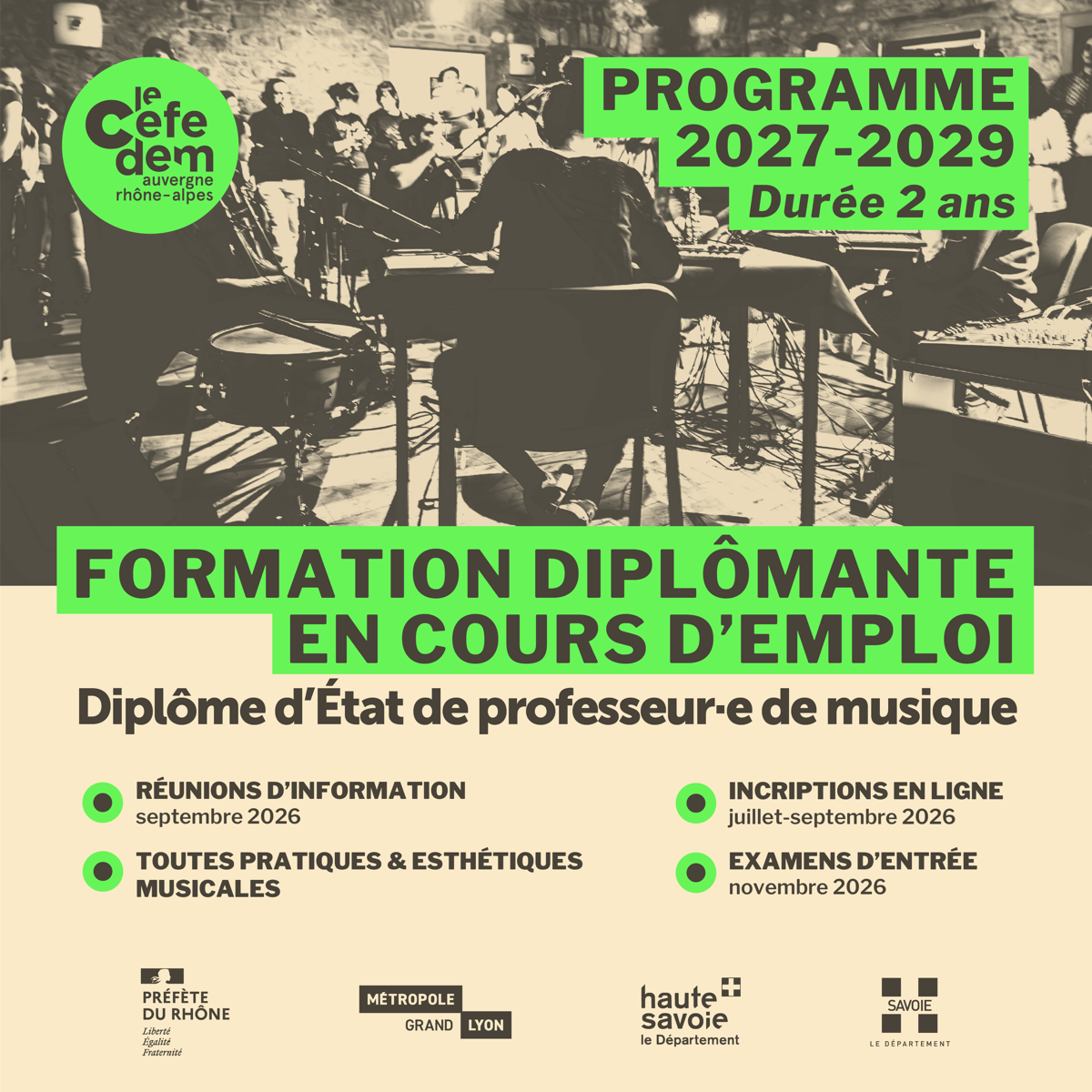 Menant à l’obtention du Diplôme d’État de professeur de musique, ce programme s’adresse aux enseignant·e·s des structures d’enseignement spécialisé de la musique (écoles de musique associatives, conservatoires, MJC, etc.) et aux musicien·ne·s ayant une expérience de la médiation artistique (accompagnement de groupes, animation d’ateliers, etc.) ou en reconversion professionnelle.