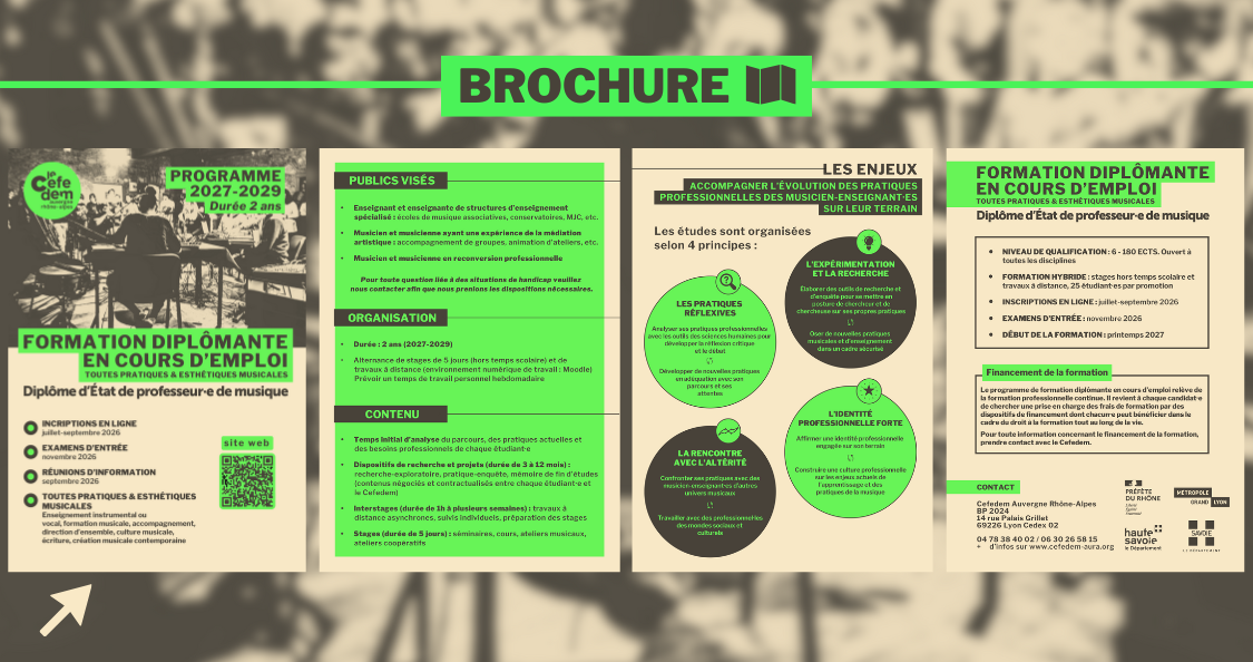Menant à l’obtention du Diplôme d’État de professeur de musique, ce programme s’adresse aux enseignant·e·s des structures d’enseignement spécialisé de la musique (écoles de musique associatives, conservatoires, MJC, etc.) et aux musicien·ne·s ayant une expérience de la médiation artistique (accompagnement de groupes, animation d’ateliers, etc.) ou en reconversion professionnelle.