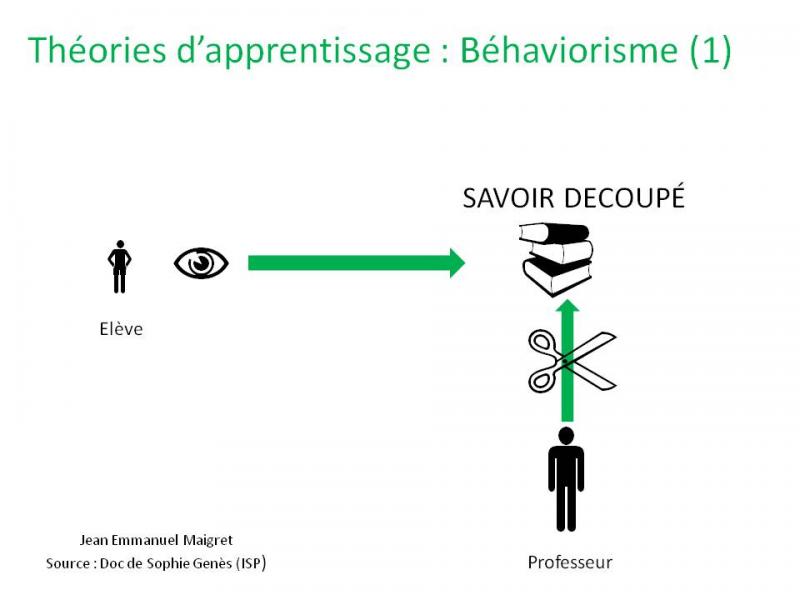 Le béhaviorisme propose un transfert sur l'homme à partir du conditionnement animal. L'enfant (ou l'apprenant), comme l'animal, apprend par la décomposition de la difficulté en étapes élémentaires. Il est ensuite récompensé plutôt que sanctionné. Ce modèle pédagogique contourne donc les erreurs afin de les éviter.